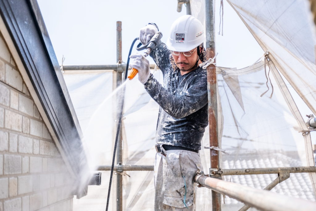 足場架設の次には、高圧洗浄を行います。高圧洗浄では、塗装をする前に、外壁についている汚れや不純物、特にコケやカビ、チョーキング現象によって浮き出た粉などをしっかり取り除き、塗装に適する塗布面に仕上げることが目的です。